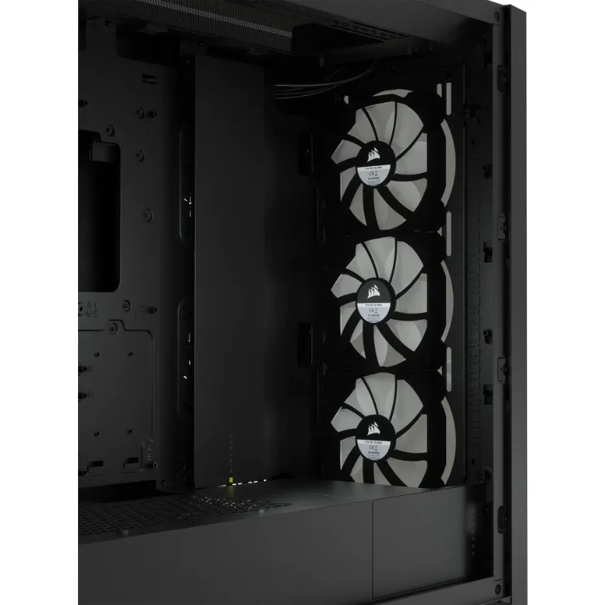 Obudowa jest wyposażona w trzy wentylatory CORSAIR SP RGB ELITE 120 mm z łopatkami AirGuide zapobiegającymi powstawaniu zawirowań, dzięki czemu przepływ powietrza jest bardziej skoncentrowany, a chłodzenie skuteczniejsze.