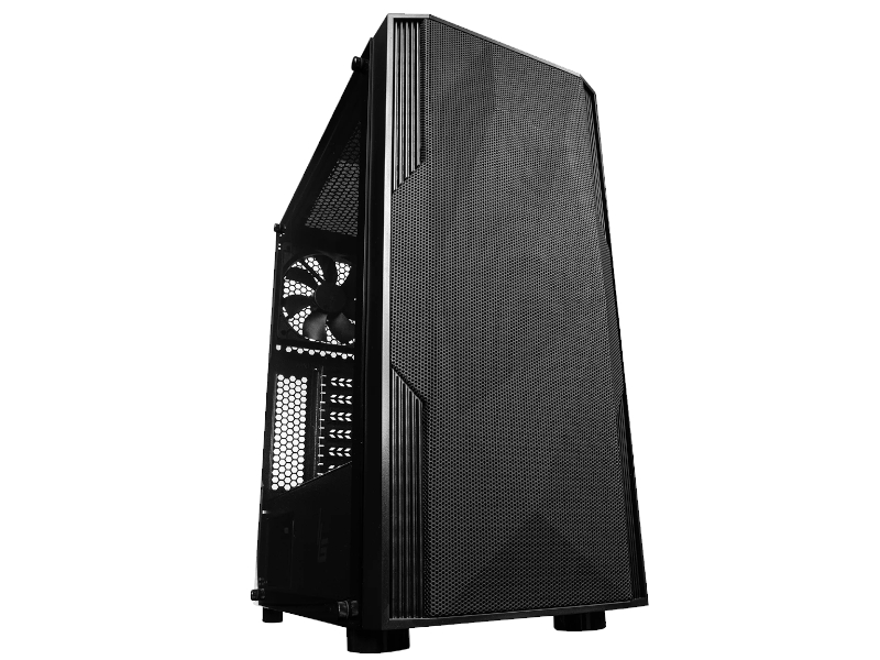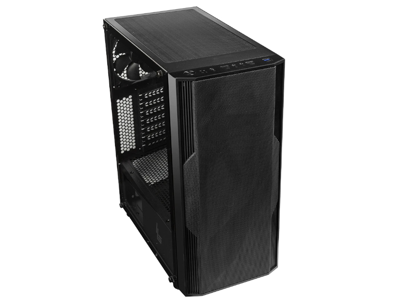 Logic Agir to obudowa o standardzie Midi Tower, dzięki czemu ma pojemne wnętrze, w którym pomieścisz wydajne komponenty. Obudowa charakteryzuje się również tajemniczym wyglądem dzięki czarnej kolorystyce oraz perforowanemu przedniemu panelowi. Konstrukcja przedniego panelu sprawia, że całość zapewnia idealny przepływ powietrza, a panel boczny z hartowanego szkła doskonale wyeksponuje gamingowe podzespoły.