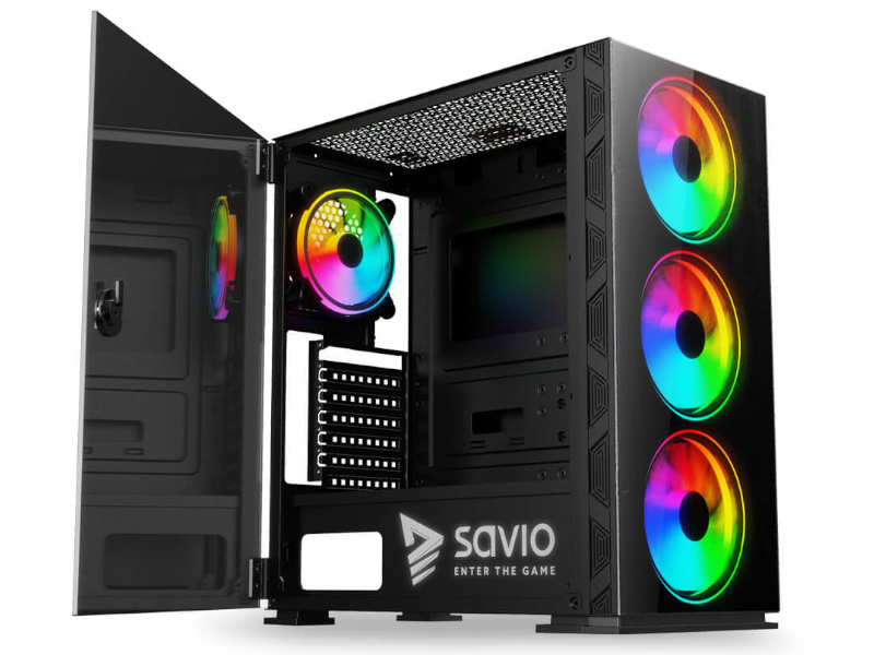 Gamingowa obudowa Savio wykonana została ze stali SPCC 0.6mm w czarnym kolorze. Panel boczny ze szkła hartowanego pozwala na podziwianie podzespołów komputera podczas jego pracy. Front ze szkła hartowanego eksponuje przestrzeń na wentylatory. Przednia część górnego panelu mieści jedno gniazdo USB 3.0, dwa gniazda USB 2.0, oraz wejście HD AUDIO.