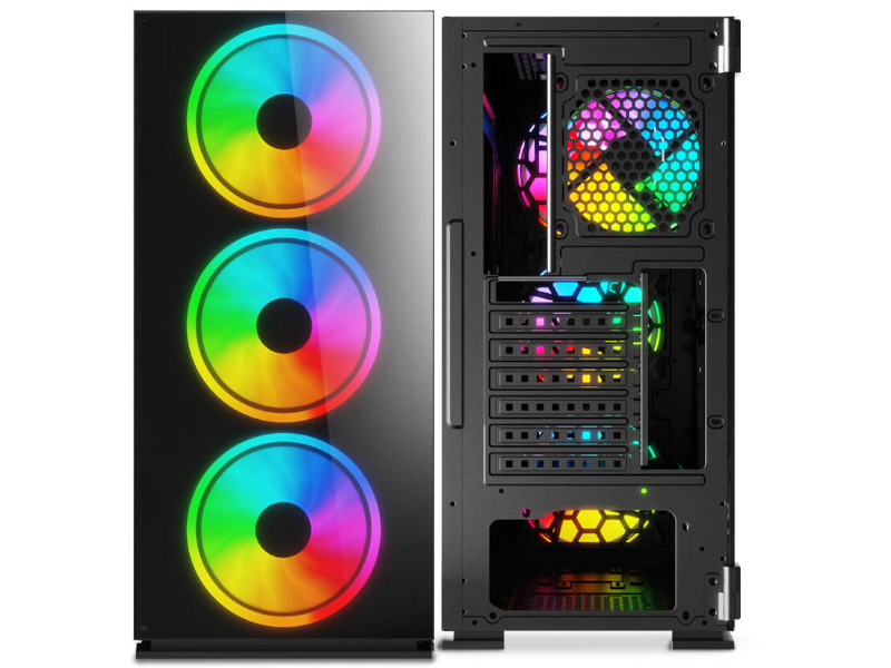 podświetlenie RGB wentylatorów Dwa filtry przeciwkurzowe (góra i dół) Panel boczny ze szkła hartowanego brak zasilacza w zestawie Panel przedni ze szkła hartowanego Otwierany panel boczny  |