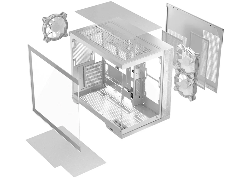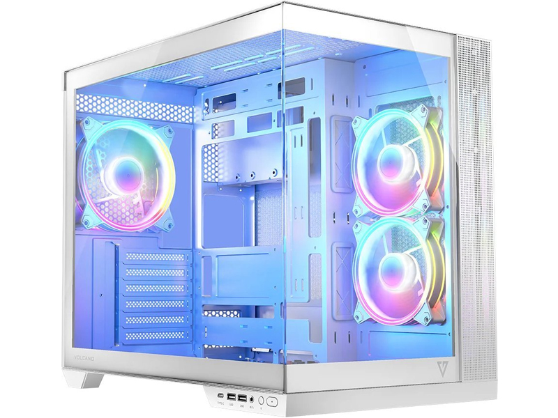 Model Volcano Panorama wpisuje się w najnowsze trendy eksponowania zainstalowanych komponentów. Jeden panel z hartowanym szkłem to za mało – tutaj przygotowaliśmy możliwość pełnej ekspozycji komputera. Droga karta graficzna, moduły RAM, chłodzenie procesora, to wszystko szkoda chować w zamknięciu. Jeżeli składasz komputer z pieczołowicie dobranymi podzespołami, wiemy jak ważna jest dla Ciebie możliwość wystawienia ich na światło dzienne. Przygotowaliśmy kilka wersji modelu, w tym z aż siedmioma fabrycznie zainstalowanymi wentylatorami, pięcioma, lub trzema, dając szerokie pole do konfiguracji. A wybierając Volcano Panorama otrzymujesz przede wszystkim możliwość montażu płyt głównych z odwróconymi złączami, mnóstwo miejsca na podzespoły – długie karty graficzne i wysokie chłodzenie procesora, złącze USB-C i dwa USB 3.0 oraz dwukomorową konstrukcję, gdzie pionowo montowany zasilacz odseparowany został od części montażowej. Wszystko zamknięte w dwóch szklanych panelach dla jak najlepszego efektu.