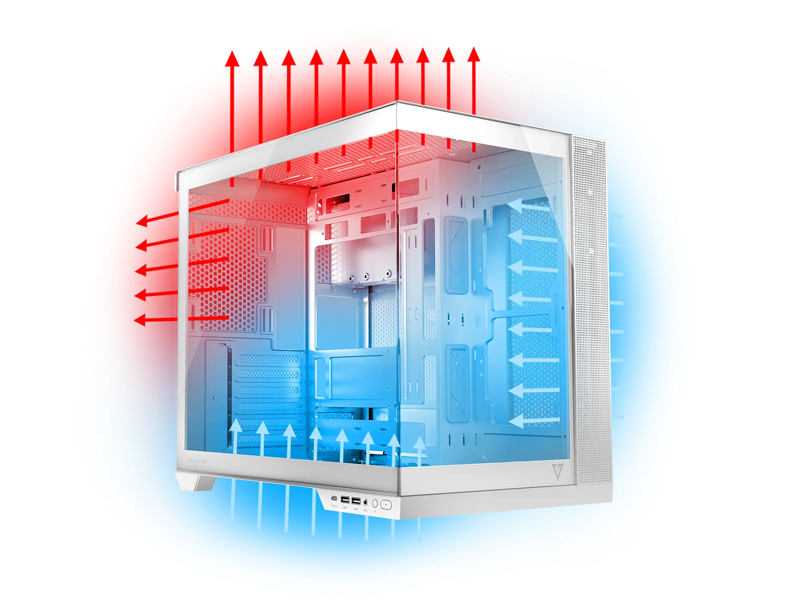 Często jest tak, że wybierając obudowę trzeba iść na kompromis – albo będzie ładna, albo będzie przewiewna. W Volcano Panorama nie planujemy kompromisów. Dlatego w parze z nowoczesnym wzornictwem idzie również dobra wentylacja. Przewiewny panel górny, wentylowana część na panelu od strony serwisowej i od spodu, przy odpowiednim układzie wentylatorów pozwala na chłodną pracę całego komputera, nawet podczas intensywnych i długich godzin grania. Obudowa przystosowana jest też do montażu chłodzenia wodnego. Na górze i dole obudowy można zamontować chłodnice do 360 mm. Jest to odpowiednia ilość miejsca na montaż większości najefektywniejszych chłodzeń dostępnych na rynku.