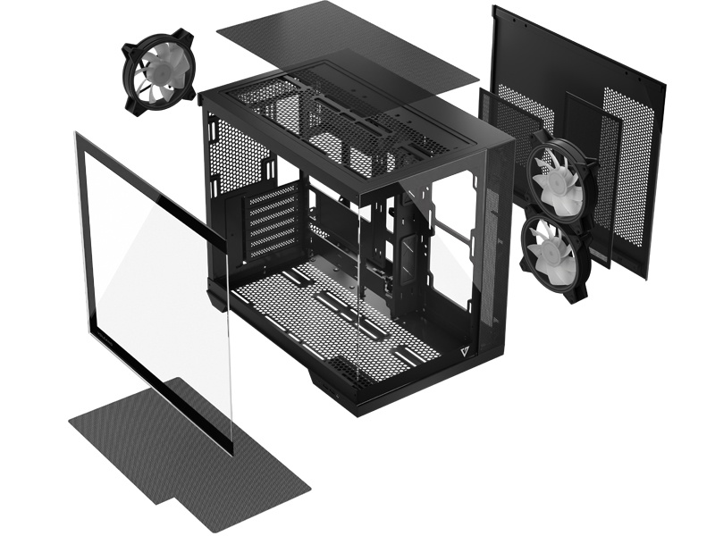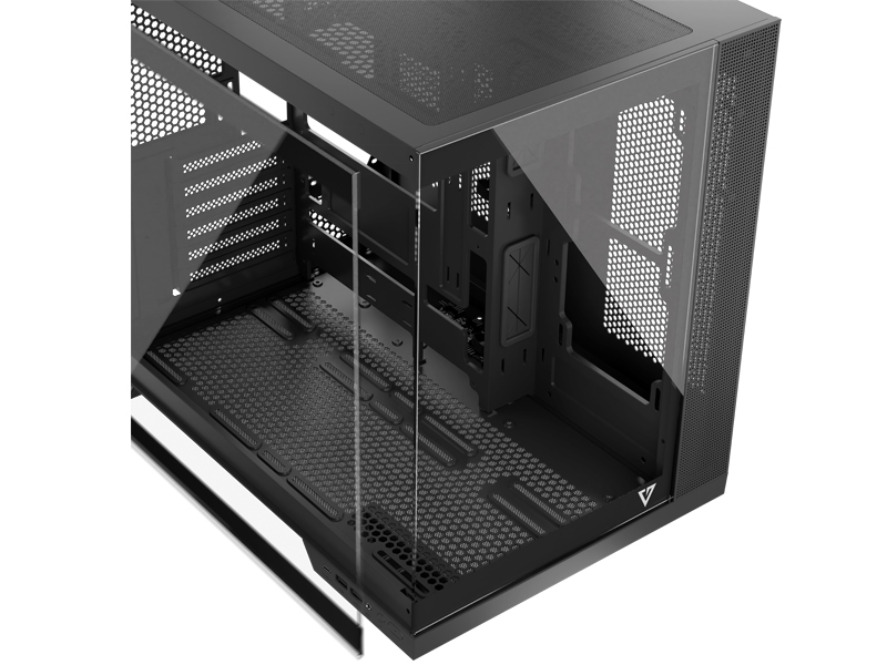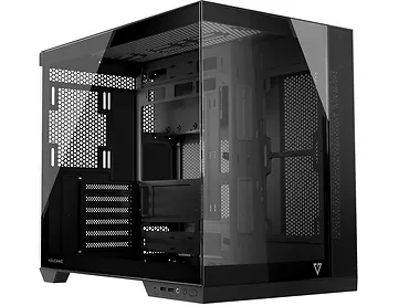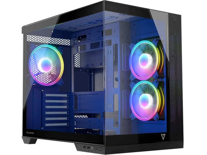 Model Volcano Panorama wpisuje się w najnowsze trendy eksponowania zainstalowanych komponentów. Jeden panel z hartowanym szkłem to za mało – tutaj przygotowaliśmy możliwość pełnej ekspozycji komputera. Droga karta graficzna, moduły RAM, chłodzenie procesora, to wszystko szkoda chować w zamknięciu. Jeżeli składasz komputer z pieczołowicie dobranymi podzespołami, wiemy jak ważna jest dla Ciebie możliwość wystawienia ich na światło dzienne. Przygotowaliśmy kilka wersji modelu, w tym z aż siedmioma fabrycznie zainstalowanymi wentylatorami, pięcioma, lub trzema, dając szerokie pole do konfiguracji. A wybierając Volcano Panorama otrzymujesz przede wszystkim możliwość montażu płyt głównych z odwróconymi złączami, mnóstwo miejsca na podzespoły – długie karty graficzne i wysokie chłodzenie procesora, złącze USB-C i dwa USB 3.0 oraz dwukomorową konstrukcję, gdzie pionowo montowany zasilacz odseparowany został od części montażowej. Wszystko zamknięte w dwóch szklanych panelach dla jak najlepszego efektu.