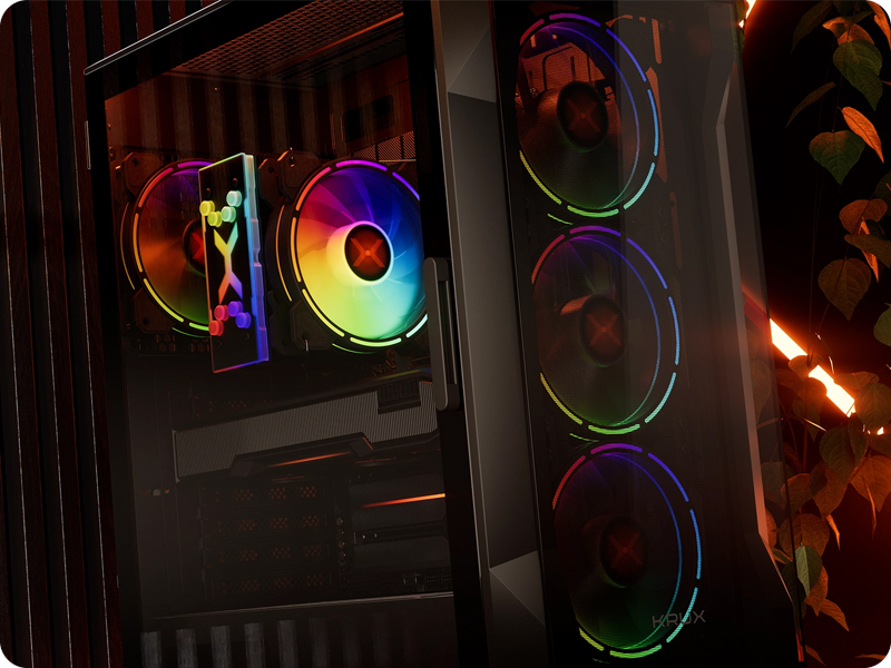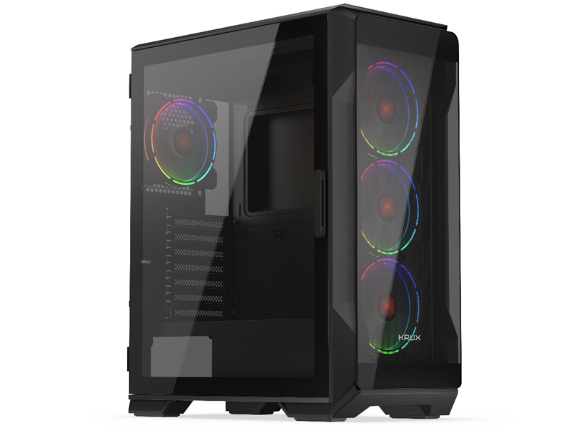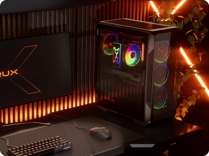 Aż szkoda by było nie wykorzystać tej całej przestrzeni, dlatego w Krux Heko znajdziesz cztery wentylatory ARGB 120 mm – trzema z przodu i jednym z tyłu. Nie dość, że wystarczą na zapewnienie niskich temperatur (przynajmniej, dopóki nie odpalisz trzech tytułów AAA naraz), to jeszcze rozświetlą wnętrze Twojej obudowy.