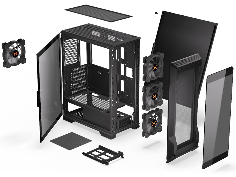 Podświetlane wentylatory System aranżowania kabli Montaż zasilacza na dole obudowy Panel boczny ze szkła hartowanego Filtry antykurzowe Panel boczny w formie drzwi |