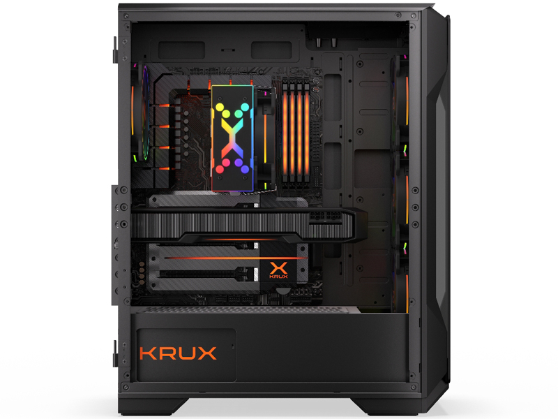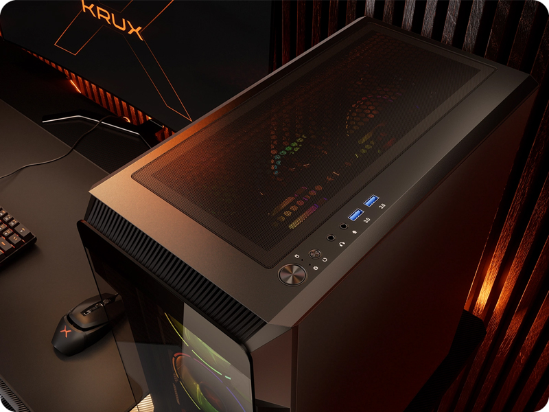 Tym, co wyróżnia Krux Heko na tle innych obudów, jest umiejscowienie slotu płyty głównej. Zostawia ono dużo miejsca na inne komponenty i chłodnicę. A jeżeli zamierzasz uzbroić swój setup w potężną kartą graficzną, to potrzebne też będzie chłodzenie odpowiedniego kalibru. Z tego samego powodu w Heko z powodzeniem wepniesz aż osiem wentylatorów o średnicy 120 mm. I to bez wciskania wszystkiego na siłę.