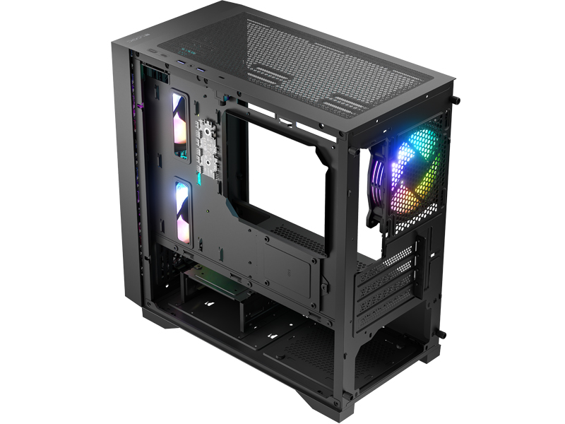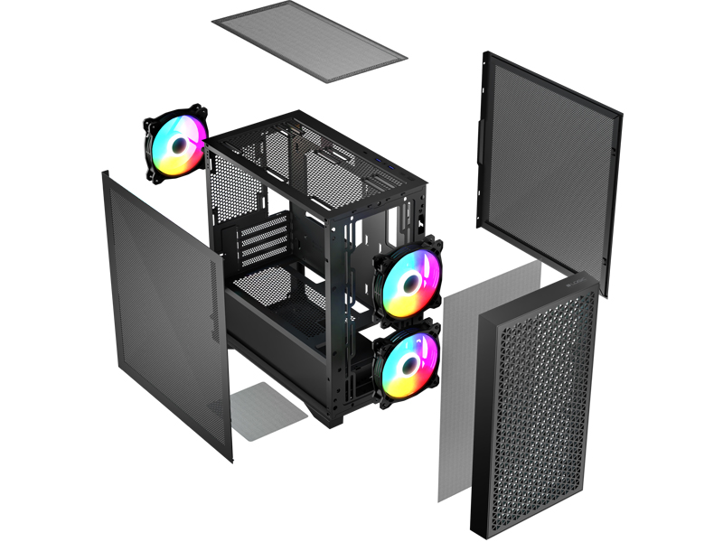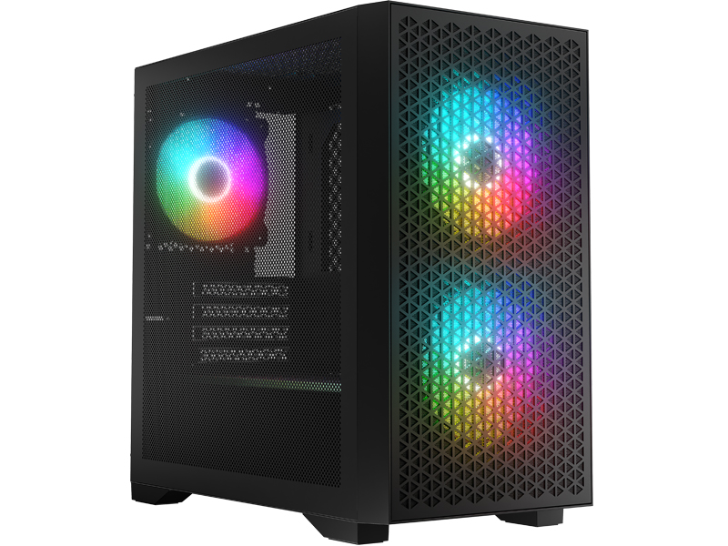Trzy wentylatory ARGB z kontrolerem w standardzie. Tyle otrzymujesz już na start po wyjęciu obudowy z pudełka. Na froncie, jak i z tyłu są to wentylatory w rozmiarze 120 mm, będące optymalnym rozwiązaniem do schłodzenia komputera. Z racji standardu Mini ATX i niewielkiemu rozmiarowi obudowy, zamontowane wentylatory skutecznie utrzymują całość w pożądanym chłodzie. Obsługa płyt głównych mini-ITX oraz Micro-ATX to kompaktowe rozwiązania do budowy komputera do nauki, pracy i zabawy. Zajmuje mniej miejsca w pokoju niż inne, standardowe obudowy ATX, a jednocześnie jest bardzo funkcjonalna.