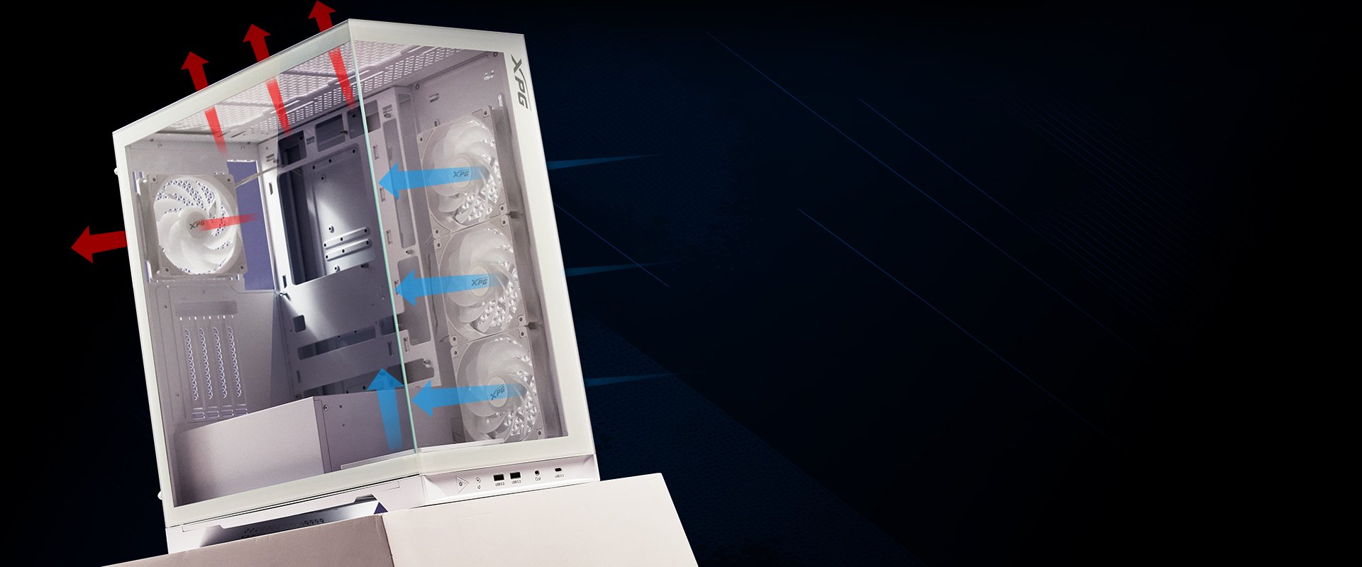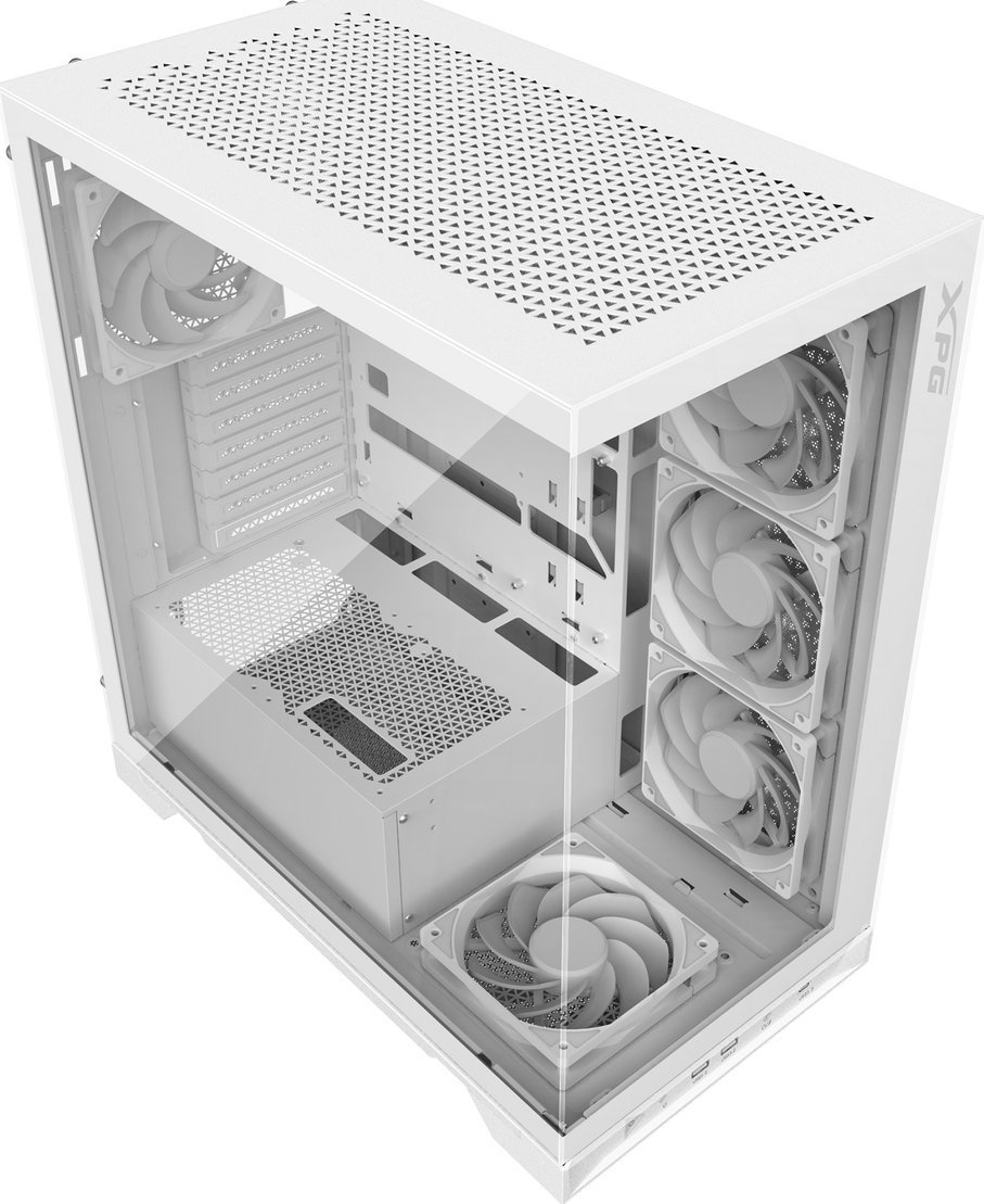Obudowa XPG Invader X BTF RGB w kolorze białym to zaawansowana konstrukcja zaprojektowana z myślą o najnowszych trendach w budowie komputerów. Obsługuje płyty główne z odwróconym układem, co pozwala na perfekcyjną organizację kabli i czysty, estetyczny wygląd wnętrza. Dzięki możliwości prowadzenia przewodów za tacką płyty głównej, użytkownik uzyskuje wyjątkowo schludny widok komputera z każdej strony. Fabrycznie zainstalowane cztery wentylatory 120 mm z zakrzywionymi łopatkami oraz jeden standardowy zapewniają wydajny przepływ powietrza. Wentylatory zostały zoptymalizowane pod kątem wlotu powietrza z boku i dołu, co zwiększa efektywność chłodzenia całego systemu, szczególnie podczas wymagających zadań, takich jak gry czy overclocking.