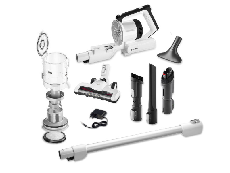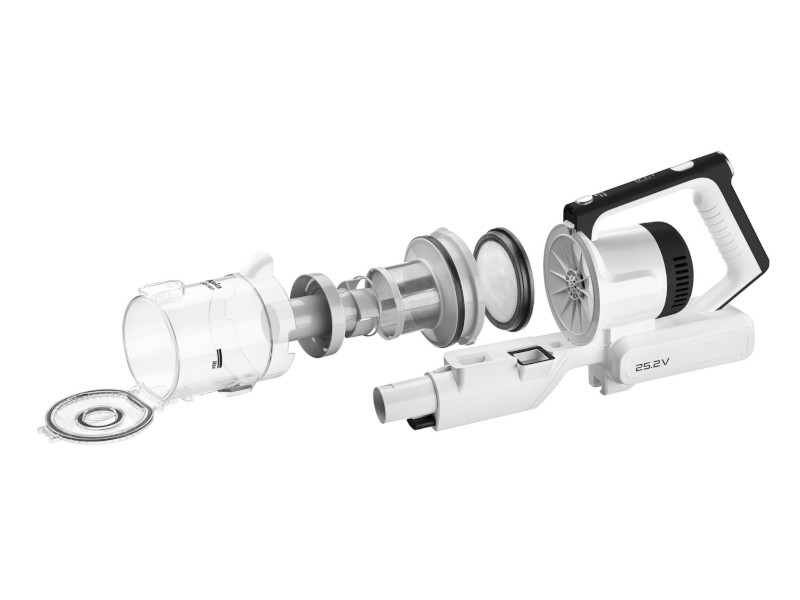 Bezprzewodowy odkurzacz 2w1 łączy w sobie cechy odkurzacza pionowego oraz ręcznego. Posiada baterię litowo-jonową zapewniającą do 40 minut pracy urządzenia. Wyposażony w dodatkowe zasilanie w elektroszczotce 10 W, które pozwala na łatwiejsze odkurzanie dywanów.