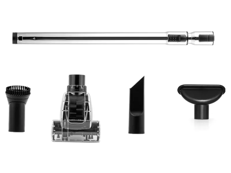 Midea B8 został starannie zaprojektowany. Jest wygodny i lekki w obsłudze, a manewrowanie pozwalają odporne na zużycie kółka. Siłę ssania dostosujesz za pomocą pokrętła. Urządzenie zostało wyposażone w 90-centymetrową rurę i 9-metrowy kabel, dzięki którym dotarcie do trudno dostępnych miejsc nie będzie stanowiło teraz problemu. W zestawie znajdziesz specjalnie zaprojektowaną szczotkę, która poradzi sobie na twardych powierzchniach. Znajdziesz również inne wymienne końcówki, które umożliwiają wysprzątanie każdego zakamarka. Szczotka szczelinowa pozwoli dokładni odkurzyć wąskie przestrzenie, okrągła idealnie sprawdzi się w czyszczeniu zasłon i mebli, szczotka turbo pomoże błyskawicznie usunąć sierść, a za pomocą szczotki do tapicerek skutecznie pozbędziesz się kurzu z materacy. Wszystkie wymienne końcówki łatwo przymocujesz do rury dzięki dołączanego do zestawu uchwytu.