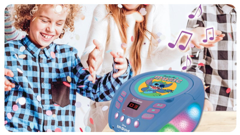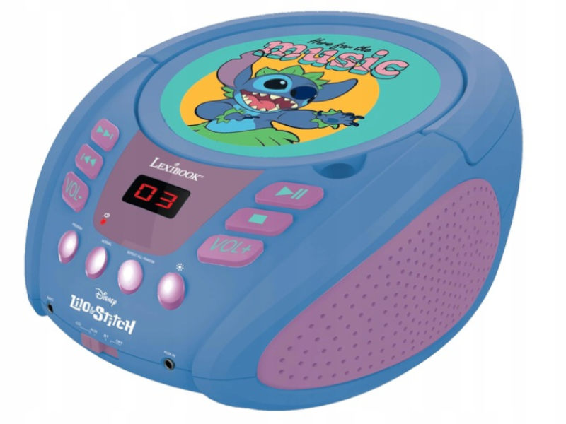 Odtwarzacz płyt CD dla dzieci został ozdobiony grafiką postaci Stitcha. Wysokiej jakości wykonanie oraz grafika sprawiają, że urządzenie będzie doskonale pasować do dziecięcego pokoju. Zastosowana rączka umożliwia wygodne przenoszenie. Dodatkowo możliwe jest odtwarzanie płyt w formacie CD, CD-R oraz CD-RW i programowanie i powtarzanie utworów. Za pomocą wejścia AUX podlączysz telefon, odtwarzacz mp3 lub inne urządzenia.
