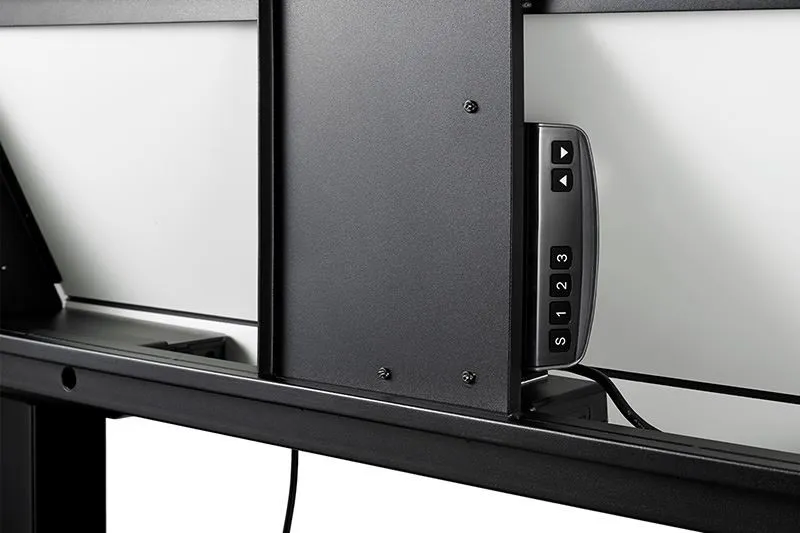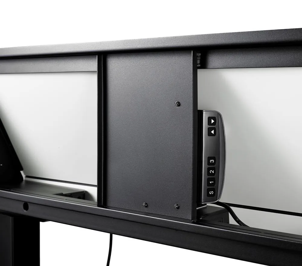 Dzięki regulacji wysokości za naciśnięciem przycisku za pomocą przewodowego pilota lub interaktywnego wyświetlacza* użytkownik ma możliwość zaprogramowania dwóch wstępnie ustawionych wysokości i szybkiego rozpoczęcia lekcji lub prezentacji.