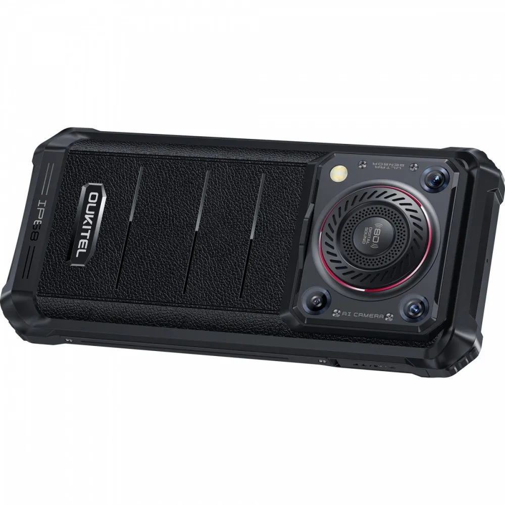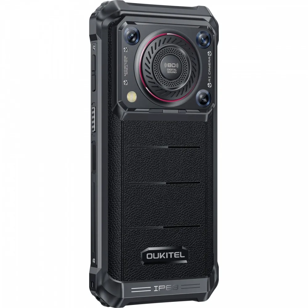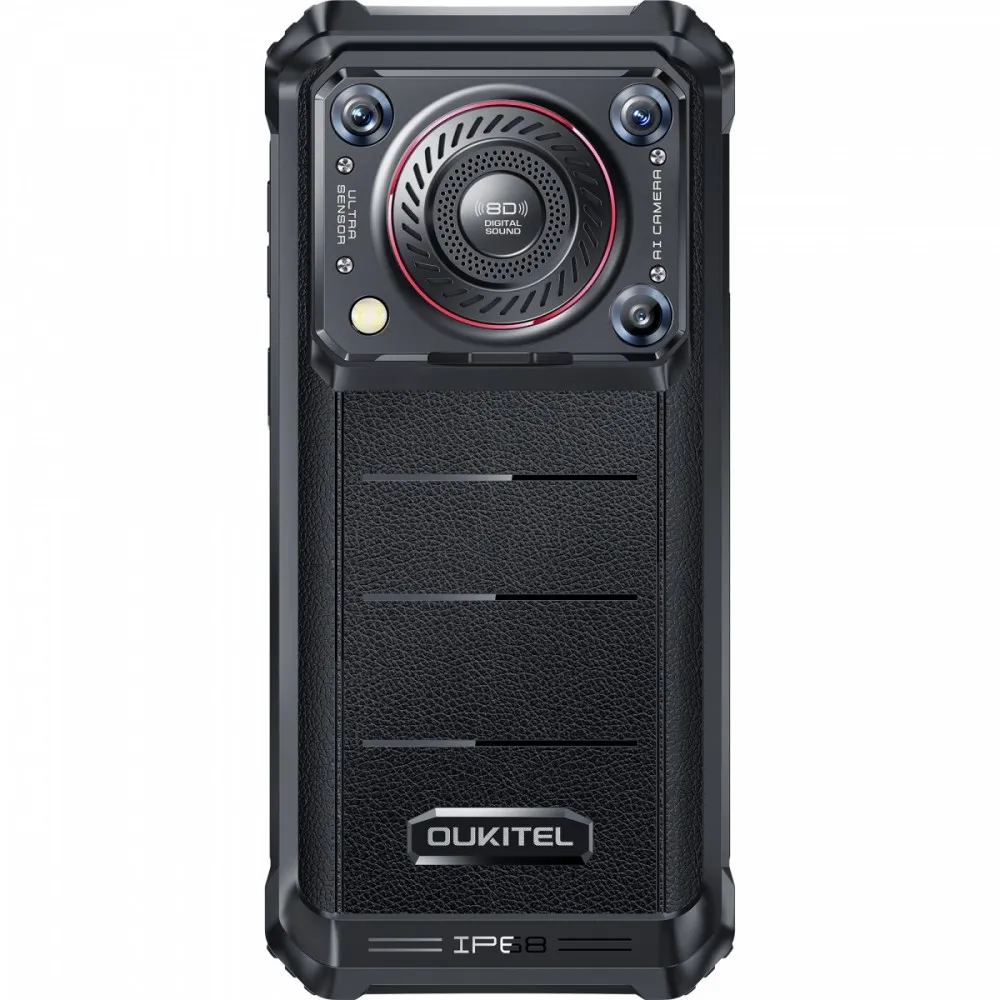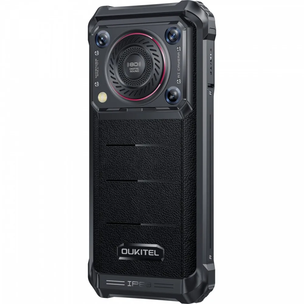 Urządzenie Smartphone Oukitel WP36 Pro charakteryzuje się niebanalnym wyglądem, który łączy surowy design z elementami wykonanymi ze skóry.