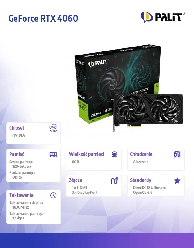 Komputery i podzespołyPodzespołyKarty graficznePalit Karta graficzna GeForce RTX 4060 Dual 8GB GDDR6 128bit