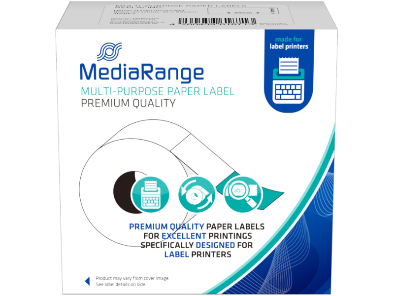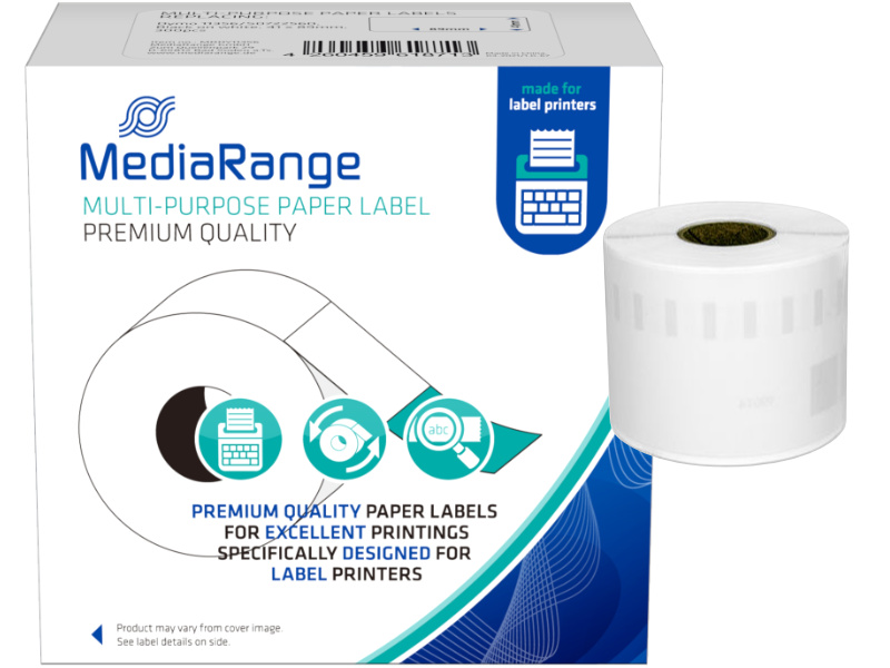 Papier do etykiet MediaRange o uniwersalnym zastosowaniu posiadają trwały klej, zapewniający wysoką jakość etykiety przez długi czas. Etykiety przylegają do praktycznie każdej powierzchni. Rolka papieru pozwala na naklejenie 300 etykiet. Prezentowany model dedykowany jest do drukarek Dymo LabelWriter 450, 450 Duo, 450 Turbo, 450 Twin Turbo, 4XL oraz SE450.