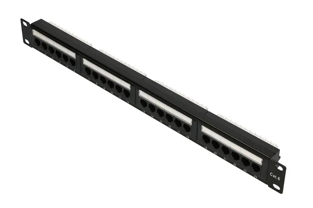 Patch panel marki Extralink kat. 6, UTP, 1U, 24 porty Panel krosowniczy (ang. patch panel) jest jednym z podstawowych elementów używanych przy budowie okablowania strukturalnego. Montuje się go w szynach szafy rackowej 19" za pomocą takich samych śrub, jakich używa się do montażu urządzeń aktywnych. Patch panel służy do terminacji kabli, które schodzą się w szafie dystrybucyjnej. Aby zachować właściwy standard połączenia, porty RJ-45 kat. 6 UTP patch panela łączy się z urządzeniem aktywnym za pomocą patchcordów o odpowiedniej kategorii i konstrukcji. Kabel podłącza się do patch panela przeznaczonym do tego narzędziem zaciskowym, zwanym też nożem Krone.