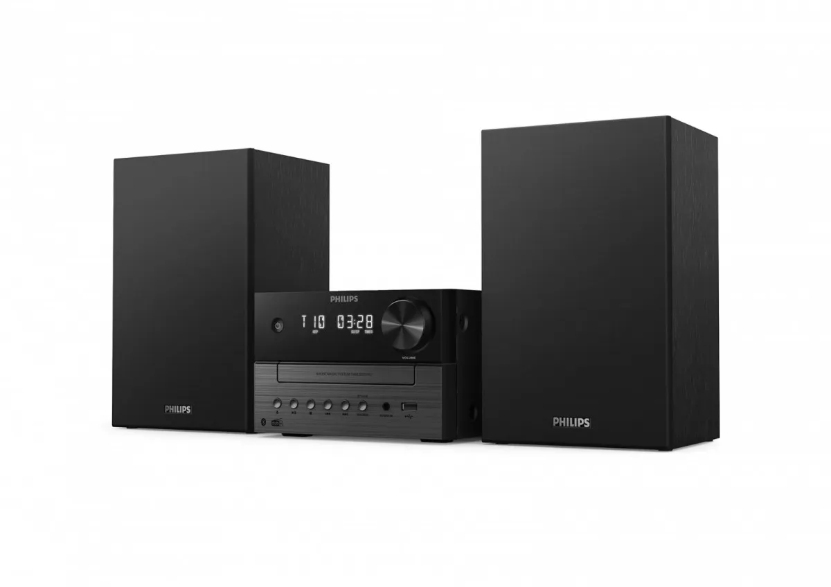 Dzięki subtelnie dwukolorowej jednostce centralnej i obudowom głośników, ta elegancka mikrowieża przypomina wzornictwo klasycznych urządzeń hi-fi. Kompaktowa konstrukcja sprawia, że łatwo jest znaleźć dla niej miejsce w domu, a z przodu urządzenia znajdują się przyciski do odtwarzania i wyboru źródła.