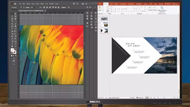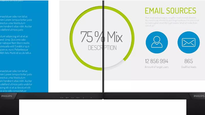 Nowe monitory firmy Philips mają niezwykle wąskie obramowanie, które nie odciąga uwagi od obrazu i pozwala na uzyskanie jego maksymalnego rozmiaru. Szczególnie w przypadku łączenia wielu monitorów, także w trybie kafelków, np. dla potrzeb gry, tworzenia projektów graficznych oraz profesjonalnych zastosowań, wyświetlacze z bardzo wąską ramą zapewniają wrażenie korzystania z jednego dużego wyświetlacza.