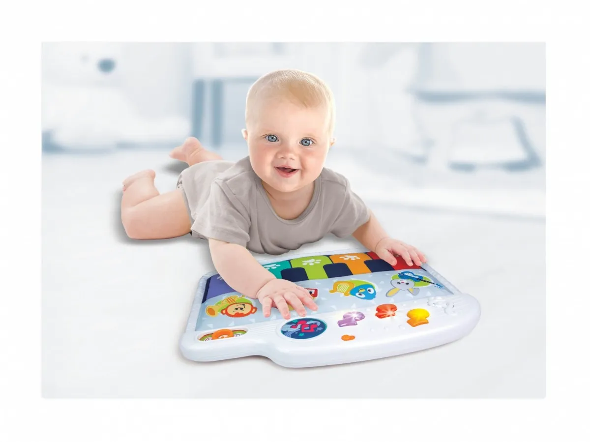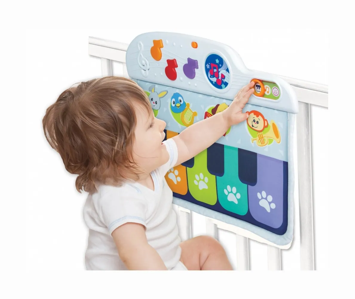 Pianinko do łóżeczka, które zwróci uwagę dziecka i zapewni rozrywkę na dłużej. Pianinko jest bezpieczne i mięciutkie, wydaje dźwięki. Maluch może bawić się w łóżeczku siedząc, naciskając kolorowe nutki albo leżąc, naciskając stopkami. Może bawić się pianinkiem również poza swoim łóżeczkiem. Zabawka posiada trzy tryby zabawy. Można ustawić dźwięk samego pianina albo trzy inne instrumenty; gitarę, harfę lub trąbkę .Posiada dwa tryby głośności. Podczas zasypiania, spokojna melodia pomoże zamknąć oczka.