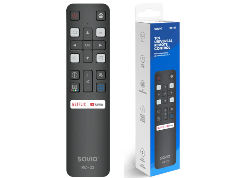 Pilot uniwersalny Savio RC-23 został stworzony z myślą o telewizorach marki TCL. Stanowi zamiennik oryginalnego pilota, odwzorowując wszystkie jego funkcje. Pilot RC-23 został wykonany z najwyższej jakości materiałów, co przekłada się na jego trwałość i niezawodność przez długi czas. Ergonomiczna konstrukcja z zaokrąglonymi krawędziami oraz starannie rozmieszczone przyciski sprawiają, że korzystanie z pilota jest wygodne i intuicyjne. Klawisze są odporne na ścieranie, dzięki czemu pilot zachowuje estetyczny wygląd nawet przy intensywnym użytkowaniu.
