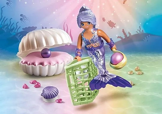 Odkryj magiczne przygody z uroczym zestawem PLAYMOBIL Syrenka z perłową muszelką. Syrenka chętnie szuka pereł na dnie morza i zbiera je za pomocą specjalnego chwytaka. Za pomocą sieci przenosi zebrane perły do dużej muszli, w której je przechowuje. Pięknie zaprojektowane figurki i zwierzęta z podwodnego świata Princess Magic inspirują dzieci do przeżywania nowych przygód. Zestaw figurek do zabawy zawiera syrenkę, pudełko z muszelkami, chwytak na perły, małe muszelki i wiele innych wspaniałych dodatków. Idealny pomysł na prezent lub upominek dla pomysłowych dzieci w wieku od 4 lat.