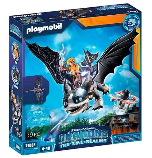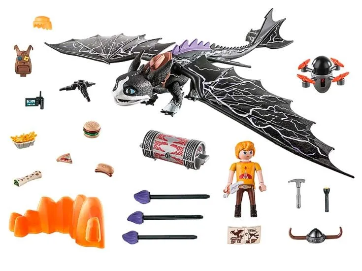 1300 lat po wydarzeniach z Jak wytresować smoka, smoki są dziś tylko legendą dla współczesnego świata. Kiedy anomalia geologiczna wywołuje olbrzymi, milowy wybuch na powierzchni Ziemi, naukowcy z całego świata gromadzą się w nowym ośrodku badawczym, aby zbadać tajemnicze zjawisko. Wkrótce grupa dzieci, które zostały zabrane przez rodziców na miejsce, ujawnia prawdę o smokach i ich kryjówkach tajemnicę, którą muszą zachować dla siebie, aby chronić to, co odkryli. Tom jest mądrym, młodym poszukiwaczem przygód. Wychowany przez matkę naukowca, jej ciekawska natura przeniosła się na niego. Tom ma impulsywną potrzebę odkrywania i sprawdzania różnych rzeczy, ale czasem zapomina o konsekwencjach. Smok Toma to grzmot. Nocny smok, który stracił dom i drogę. Dzięki zestawowi do gry Thunder & Tom od PLAYMOBIL możesz teraz zabrać ze sobą Smoczą Przełęcz do domu. Thunder może poruszać wszystkimi czteremi nogami, a także głową i skrzydłami. Zintegrowane siodełko pozwala Tomowi jeździć na Thunder. Thunder ma moduł świetlny, który może wystrzelić plazmę z ust. Odbywa się to poprzez umieszczenie strzałki w paszczę smoka, a następnie zamknięcie. Naciśnięcie głowy lub uszu powoduje wypuszczenie strzały z ust.