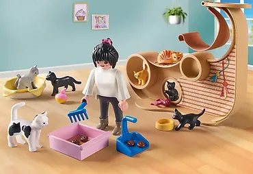 Wybierz się do uroczej Kociej kawiarni PLAYMOBIL, gdzie możesz popijać wyśmienitą kawę oraz cieszyć obecnością milusińskich kotków! Goście mogą delektować się babeczkami i kawą przy przytulnym stoliku, podczas gdy figlarne koty eksplorują ściankę wspinaczkową, wylegują się na huśtawce lub gonią za zabawkami. Z mnóstwem akcesoriów, takich jak kuweta, drapak, a nawet wędka dla kota. Wiele dodatków tworzy wyjątkowy charakter tego zestawu, rozwijając wyobraźnię i empatię do zwierząt.