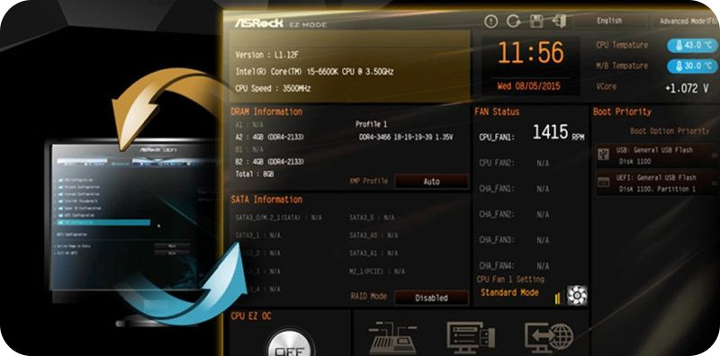 EZ Mode to tablica informacyjna, która zawiera szereg odczytów na temat obecnego stanu sytemu. Można tutaj sprawdzić najważniejsze parametry pracy komputera, takie jak taktowanie procesora i pamięci, informacje o urządzeniach SATA, prędkości obrotowe wentylatorów itp. W poziomu UEFI można tez skontaktować się z pomoca techniczną firmy ASRock. Użytkownicy mogą wybrać rodzaj problemu, z którym się spotkali, opisać go szczegółowo, a następnie opcjonalnie dodać obraz lub plik log dla zespołu wsparcia technicznego.