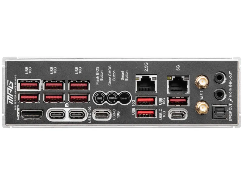 RJ45 (LAN) 2.5 Gbps - 1 szt. USB 4 Type-C - 2 szt. S/PDIF - 1 szt. Flash BIOS Button - 1 szt. HDMI - 1 szt. RJ45 (LAN) 5 Gbps - 1 szt. USB 3.2 Gen. 2 - 9 szt. Złącze anteny Wi-Fi - 2 szt. Audio jack - 2 szt. Przycisk Clear CMOS - 1 szt. USB 3.2 Gen. 2 Type-C - 2 szt. |