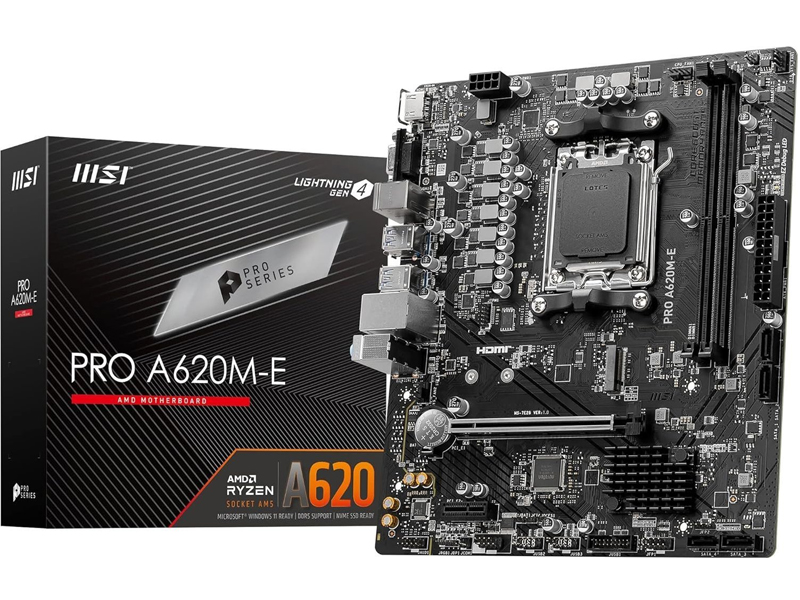 Pomimo kompaktowego formatu Micro-ATX, płyta oferuje bogaty zestaw złączy – w tym HDMI, DVI, USB 3.2 oraz PCIe 4.0. Znajdziemy tu także port M.2 na szybkie dyski SSD NVMe oraz cztery złącza SATA 6 Gb/s. Dzięki Realtek RTL8111H możesz liczyć na stabilne połączenie sieciowe, a układ dźwiękowy Realtek ALC897 zapewni czysty i dynamiczny dźwięk. MSI PRO A620M-E doskonale sprawdzi się w mniejszych obudowach bez kompromisów na funkcjonalności.