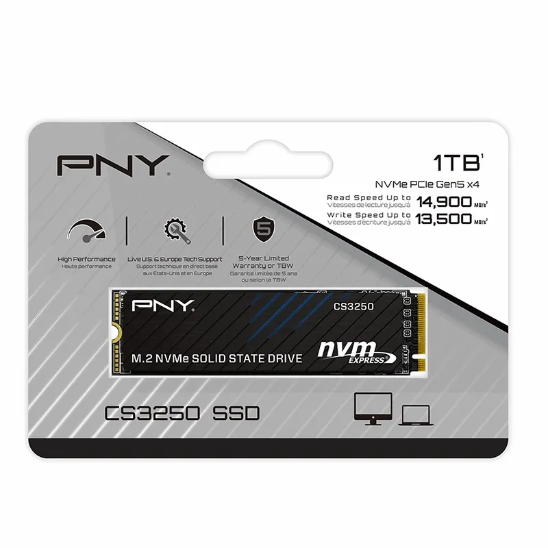 PNY CS3250 M.2 NVMe Gen5 x4 to doskonały wybór jako uniwersalny dysk SSD do modernizacji komputera stacjonarnego lub laptopa obsługującego NVMe Gen5. Interfejs NVMe Gen5 x4 zapewnia błyskawiczną wydajność, dzięki czemu jest idealnym ulepszeniem dla entuzjastów PC, graczy oraz twórców treści.