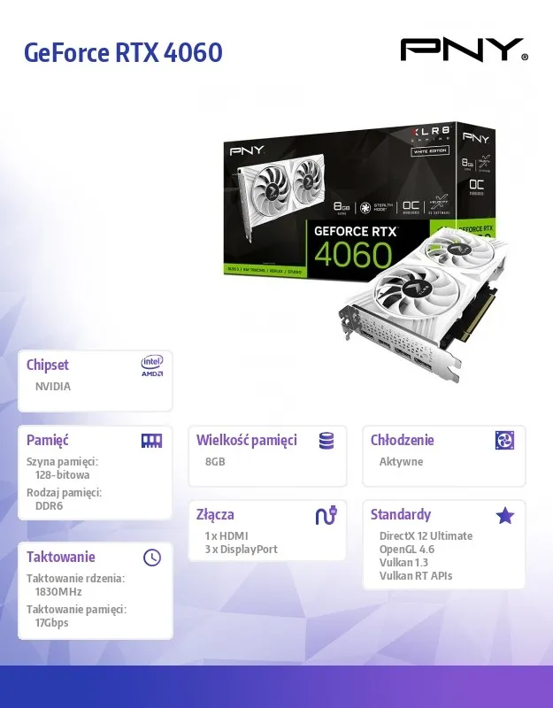 Komputery i podzespołyPodzespołyKarty graficznePNY Karta graficzna GeForce RTX 4060 8GB VERTO OC DUAL FAN DLSS 3