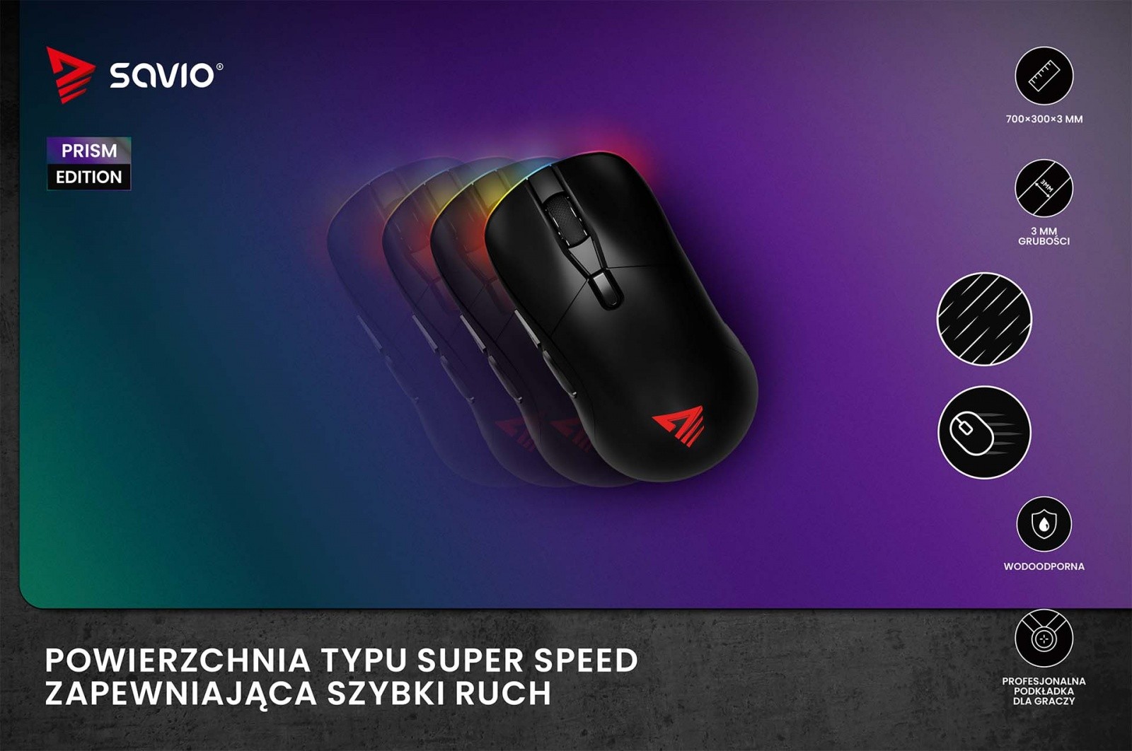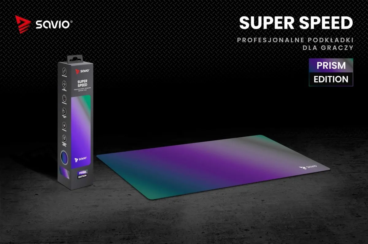 Podkładka gamingowa Savio Prism Edition Super Speed L to połączenie nowoczesnego designu, precyzji i funkcjonalności, stworzone z myślą o najbardziej wymagających graczach. Jej wyjątkowa, pryzmatyczna kolorystyka wyróżnia stanowisko gamingowe, a specjalna powierzchnia zapewnia pełną kontrolę i płynność ruchów w każdej sytuacji. To akcesorium, które nie tylko poprawia komfort rozgrywki, ale też nadaje jej profesjonalny charakter.