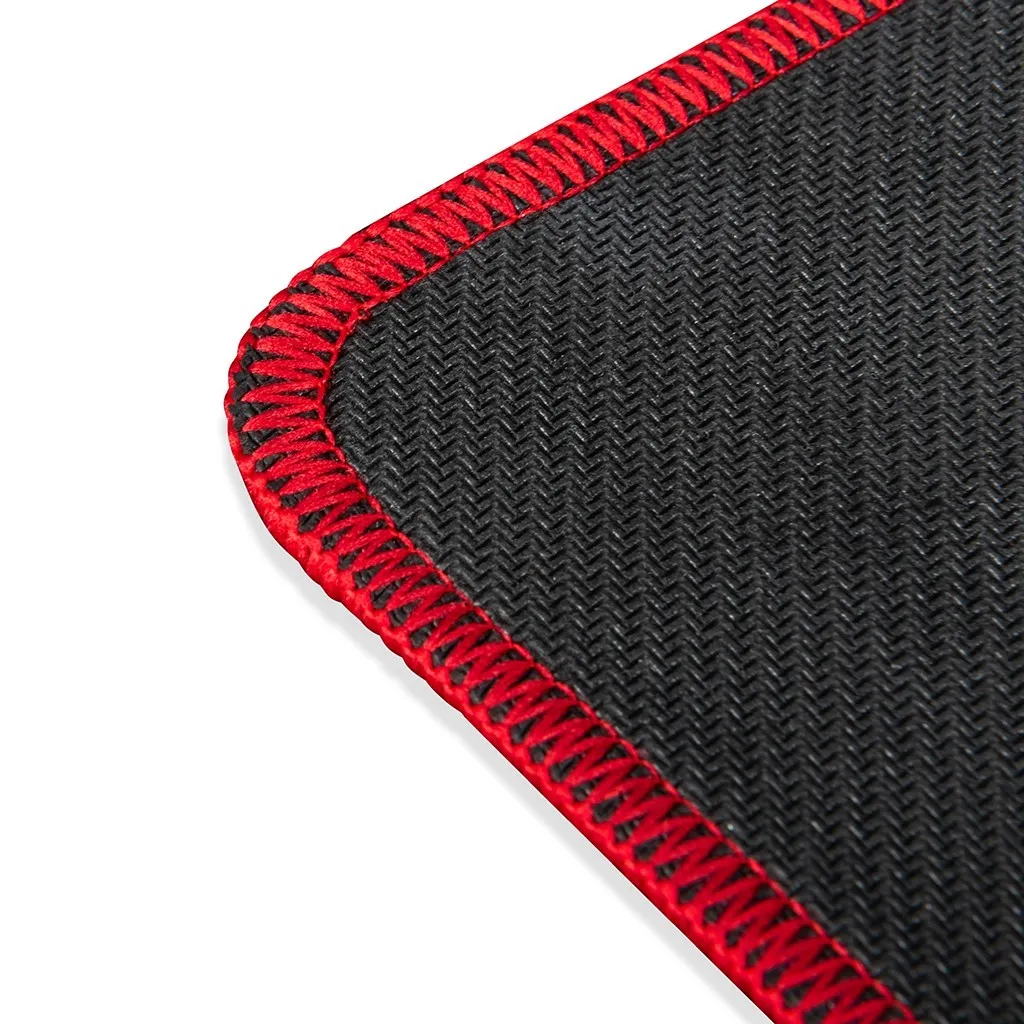 Spodnia część podkładki została wykonana z gumowanego materiału antypoślizgowego, który skutecznie utrzymuje ją w jednym miejscu nawet podczas intensywnego użytkowania. Niezależnie od tego, czy korzystasz z dynamicznych gier FPS, czy spokojniejszych tytułów symulacyjnych, podkładka pozostaje stabilna i zapewnia pełną kontrolę nad sprzętem. Dodatkową trwałość zapewniają obszyte ranty wykonane z wytrzymałej czerwonej nici. Takie wykończenie nie tylko chroni krawędzie przed strzępieniem i wydłuża żywotność produktu, ale także podkreśla gamingowy charakter stanowiska komputerowego. Czerwone obszycie wyraźnie kontrastuje z czarną powierzchnią podkładki oraz biurka, tworząc estetyczny i nowoczesny wygląd.