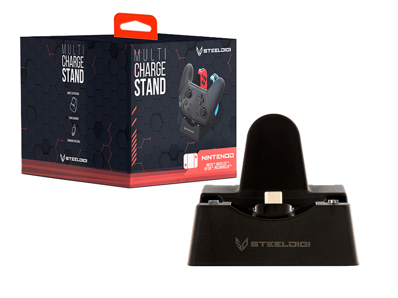 Podstawka SteelDigi Multi Charge Stand została wyposażona w 3 porty ładujące: 1 port USB-C, który posłuży do ładowania konsoli Nintendo Switch / Switch Lite lub tradycyjnego kontrolera oraz 2 porty do ładowania padów Joy-Con. Stacja ładująca SteelDigi jest kompatybilna z Nintendo Switch, Nintendo Switch Lite, kontrolerami Joy-Con oraz Pro Controllers. Podstawka Multi Charge Stand do kontrolerów Nintendo posiada 2 charakterystyczne diody o kształtach "+" i "-", wskazujące status ładowania umieszczonych na niej urządzeń. Stand SteelDigi posiada kompaktowy, niewielki kształt oraz antypoślizgowe podkładki, zapobiegające przesuwaniu się podstawki. Do podstawki dołączony został czarny kabel USB - USB-C o długości 100 cm, który pozwala na wygodne podłączenie stacji ładującej do źródła zasilania.