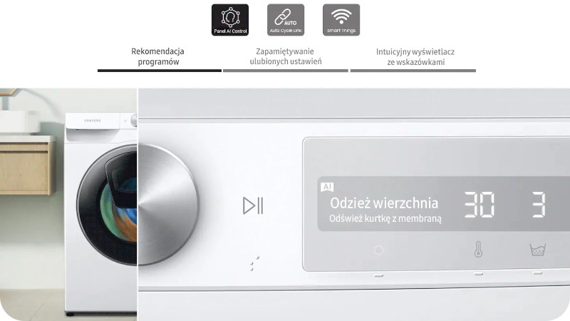 Pralka samsung została wyposażona w inteligentny panel AI control który potrafi znacznie ułatwić użytkowanie pralki. Panel pozwala personalizować i ustawiać pod siebie parametry pralki, zapamiętuje także ulubione ustawienia użytkownika i proponuje programy suszenia w zależności od programów prania. Dodatkowo możesz obsługiwać pralkę za pomocą aplikacji smart things która kontroluje pralke na okrągło.