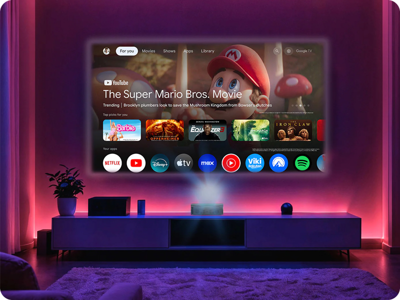 SIRIUS oferuje Google TV, zapewniając bezproblemowy dostęp do wszystkich ulubionych serwisów streamingowych i aplikacji w jednym prostym, intuicyjnym interfejsie. Od kinowych hitów i popularnych seriali, po transmisje sportowe na żywo i YouTube – wszystko, co kochasz, jest na wyciągnięcie ręki. Dzięki jasności 600 ANSI lumenów projektor SIRIUS gwarantuje jasny, ostry i żywy obraz, wzbogacając każdą scenę i zapewniając wciągające i immersyjne wrażenia wizualne.