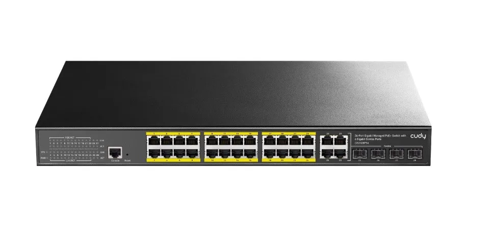 - 24 porty Gigabit POE, 4 porty Gigabit Combo, 1 port konsolowy