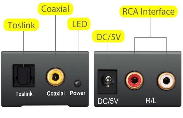 Możesz podłączyć konwerter do telewizora za pomocą kabla Toslink (zwanego także cyfrowym S / PDIF lub kablem optycznym) kabla koncentrycznego, i podłączyć do wzmacniacza (głośniki) za pomocą kabla RCA lub do słuchawek z kablem Jack stereo 3,5 mm. Konwerter może być również używany z PS3, PS4, XBox, Xbox One, odtwarzacze Blu-ray, HD DVD itp., Które nie mają wyjść RCA (L / R) lub wyjścia Jack 3,5 mm.