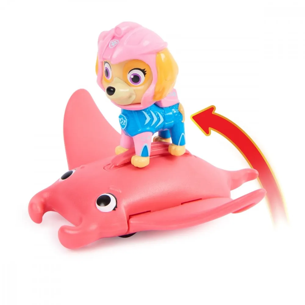 Przygotuj się na ekscytujące przygody ratownicze na pełnym morzu ze swoimi ulubionymi szczeniakami i ich nowymi wodnymi przyjaciółmi, gdy udają się na ekscytujące misje ratunkowe z Aqua Pups PAW Patrol! Ten zestaw figurek zawiera Skye w jej zupełnie nowym kombinezonie piankowym i jej zaufanego kumpla Manta Ray! Ukochany szczeniak Psiego Patrolu jest gotowy do akcji! Przymocuj Skye do płetwy na grzbiecie Manta Ray i przetocz Manta Ray do przodu, aby aktywować ruch skrzydeł Manta Ray, gdy pędzisz na ratunek i ratujesz świat! Ten niesamowity zestaw z autentycznymi detalami i stylistyką ożywia podwodną zabawę z popularnego programu telewizyjnego! Następnie, aby uzyskać jeszcze bardziej ekscytujące misje inspirowane serią, zbierz wszystkie figurki i pojazdy zabawkowe PAWsome Aqua Pups wraz z pojazdem zespołu Whale Patroller (każdy sprzedawany osobno) na niekończące się godziny pełnych akcji przygód! Dzięki zabawkom Psi Patrol dzieci mogą odkrywać swoją wyobraźnię i rozwijać zdolności motoryczne poprzez zabawę w udawanie, gdy ożywają ulubione sceny z serialu! Figurki Psiego Patrolu, samochodziki, zestawy do zabawy i pluszaki to idealne zabawki dla chłopców i dziewczynek w wieku od 3 lat, więc przynieś do domu emocje związane z Psi Patrolem: Wodne szczenięta!