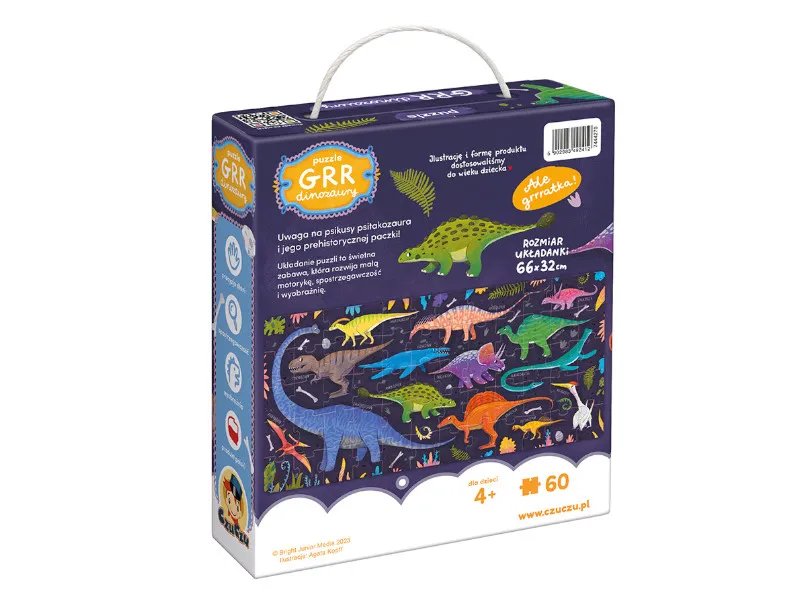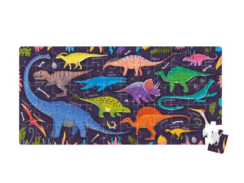 Przedstawiamy wysokiej jakości puzzle z dinozaurami dla najmłodszych odkrywców. Edukacyjny zestaw składa się z 60 elementów. Znakomicie sprawdzą się jako pierwsze puzzle z tradycyjnymi łączeniami lub kolejny zestaw w kolekcji. Piękne ilustracje przedstawiają różnorodne gatunki dinozarów, które z pewnością przypadną do gustu najmłodszym. Maluchy je uwielbiają! Zabawa z puzzlami pozwala rozwijać koordynację ręka-oko, bystre oko i inspiruje do poznawania nowych słów i zdobywania wiedzy. Dzika zabawa start! Pokaż maluchowi, jak łączyć puzzle i pomóż mu, jeśli tego potrzebuje. Układanie to wyzwanie, ale każde dopasowanie to powód do radości! Możecie zacząć od jednej lub kilku puzzli i stopniowo zwiększać ich liczbę. Te wesołe zabawy pozwalają doskonalić kluczowe dla maluszków umiejętności.