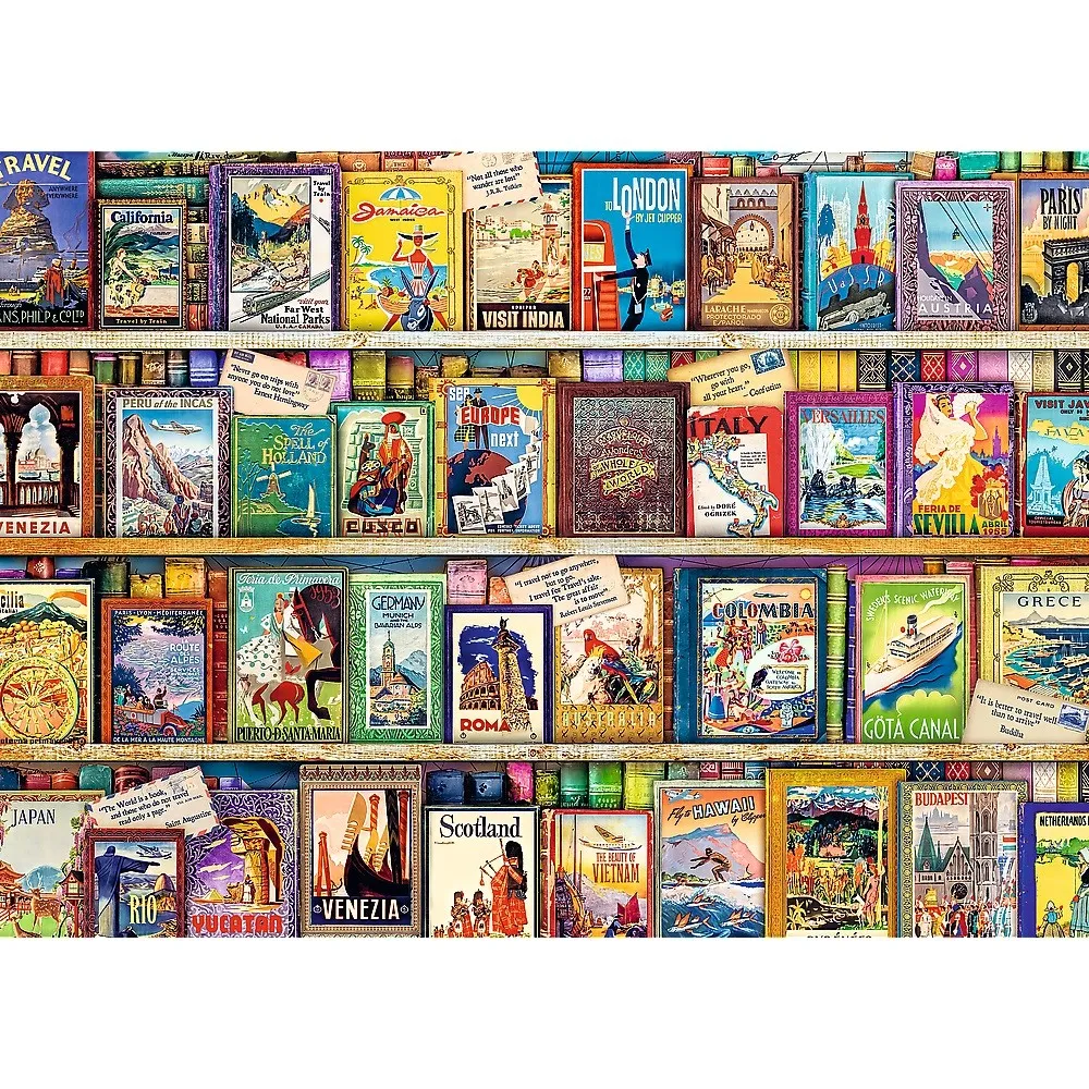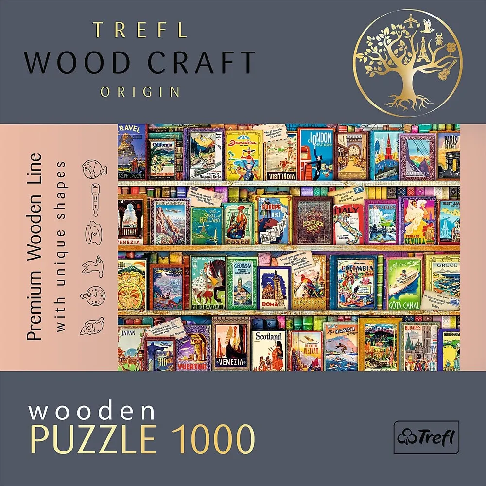 Seria drewnianych puzzli składających się z 1000 elementów jest idealna dla wszystkich miłośników układanek. Pozwoli stworzyć obrazek o wymiarach 51,9 x 37,5 cm przedstawiający kolekcję przewodników po świecie. Układanka została wykonana z drewna, a opakowanie przyjazne środowisku w całości z tektury.