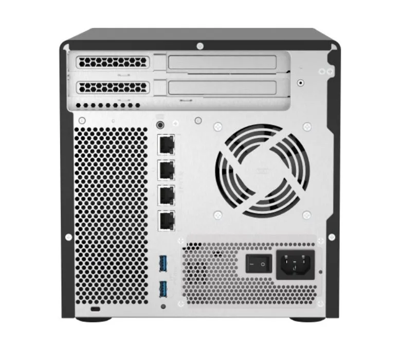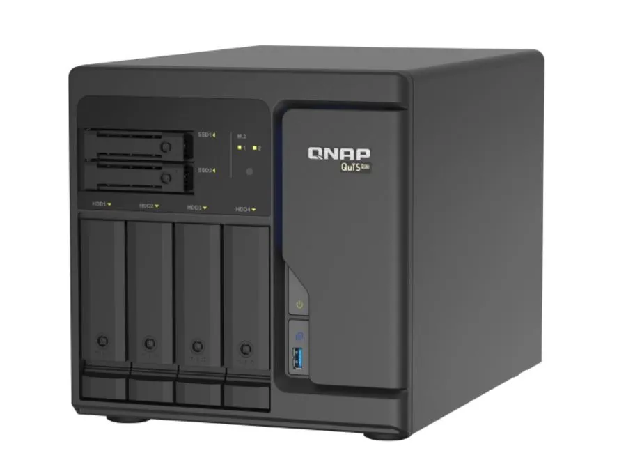 Biurkowy serwer NAS z systemem QuTS hero, procesorem Intel Xeon D i czterema portami 2.5GbE zaprojektowany pod kątem wykonywanej w czasie rzeczywistym operacji tworzenia kopii archiwalnej danych SnapSync i na potrzeby aplikacji maszyn wirtualnych.
