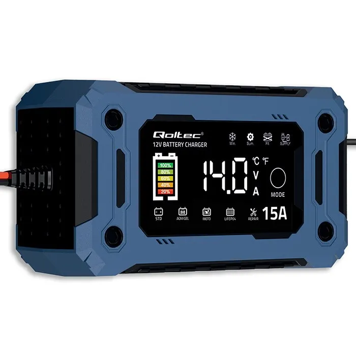Qoltec Mikroprocesorowa ładowarka 12V 15A | Prostownik z funkcją naprawy i podtrzymania zasilania podczas wymiany akumulatora | do AGM GEL LiFePO4 | LCD