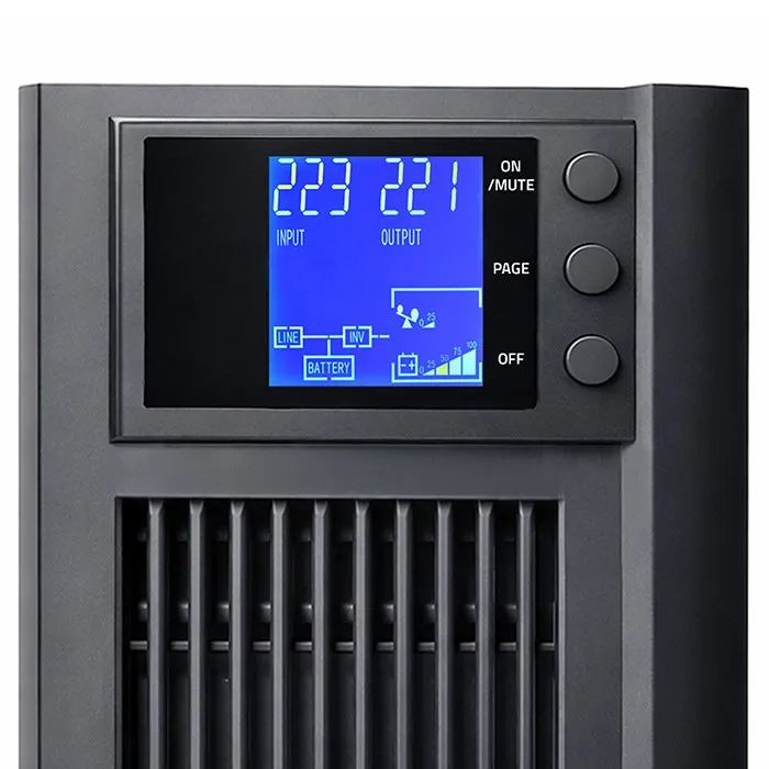 - czytelny wyświetlacz LCD, umożliwiający bieżący podgląd parametrów pracy zasilacza UPS,