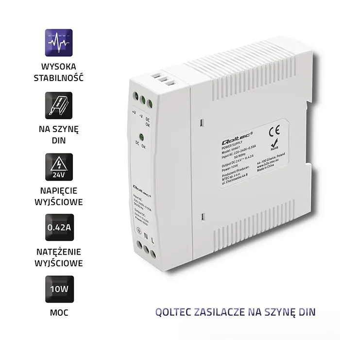 Zasilacze na szynę DIN marki Qoltec są przydatnym elementem systemów automatyki, sterowania maszynami, technice oświetleniowej oraz elektronice przemysłowej w których istotny jest rozmiar urządzeń zasilających oraz dostosowanie ich do ograniczonej przestrzeni.
