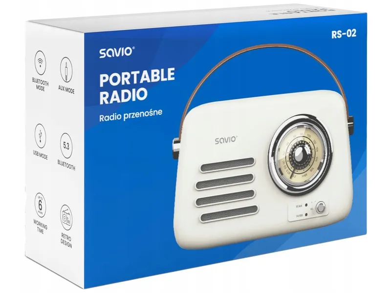 Urządzenie oferuje także możliwość odtwarzania dźwięku z innych źródeł dzięki wejściu AUX. Można do niego podłączyć na przykład odtwarzacz MP3 (urządzenie do odtwarzania muzyki zapisanej w formacie cyfrowym), laptopa lub smartfona, używając standardowego kabla mini jack (wtyczka o średnicy 3,5 mm, używana do przesyłania dźwięku między urządzeniami, np. słuchawkami i głośnikami). Model RS-02 wyposażono w głośnik o mocy 3 W i impedancji 2 Ω. Taka konfiguracja zapewnia czysty i wyraźny dźwięk, który dobrze sprawdzi się zarówno w zamkniętych pomieszczeniach, jak i na świeżym powietrzu.