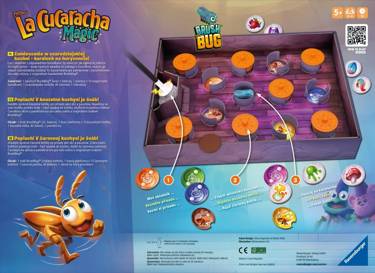 La Cucaracha Magic przenosi graczy do zaczarowanego lasu, gdzie czarownice warzą eliksiry, a niesforny karaluch zakłóca ich pracę! Zadaniem uczestników jest zapamiętywanie składników i wrzucanie ich do odpowiednich kociołków, korzystając z magicznej różdżki. Trzeba jednak uważać - jeśli karaluch wpadnie do mikstury, zamieni ją w zepsutą karaluchową papkę albo w eliksir złotego karalucha, przynosząc cenne punkty. Gra łączy pamięć i zręczność, a nieprzewidywalny ruch robala sprawia, że każda rozgrywka jest pełna emocji. Zwycięża gracz, który zdobędzie najwięcej punktów. La Cucaracha Magic to świetna propozycja dla 2-4 osób od 5. roku życia, idealna na rodzinne wieczory i dziecięce przyjęcia.