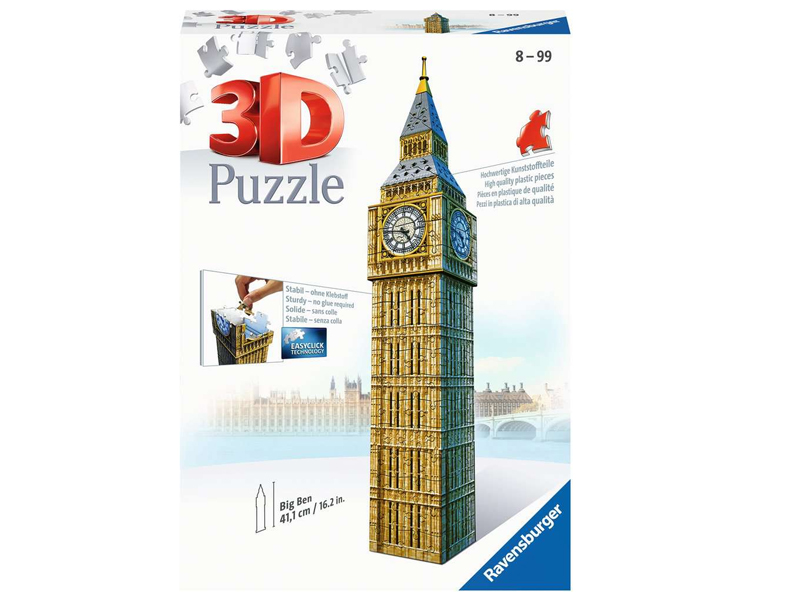 Big Ben jest wieżą zegarową w Londynie w Wielkiej Brytanii. We wrześniu 2012 roku została ona oficjalnie nazwana Elizabeth Tower, na cześć Królowej Elżbiety. Teraz, dzięki producentowi puzzli Ravensburger, możesz samodzielnie ułożyć jej replikę. Konstrukcja z puzzli 3D jest wiernie odwzorowaną budowlą, którą możesz trzymać u siebie w domu. Jeśli jesteś miłośnikiem architektury i fanem słynnych budowli, to pozycja idealna dla Ciebie. Elementy tych puzzli 3D zostały wykonane ze sztywnego tworzywa sztucznego, pozwalającego na utrzymanie się kontstrukcji bez użycia kleju. Ułożone puzzle nie rozwarstwiają się i mocno trzymają się siebie. Materiał, który został użyty do ich produkcji jest łatwy w czyszczeniu, wystarczy użyć wilgotnej szmatki.