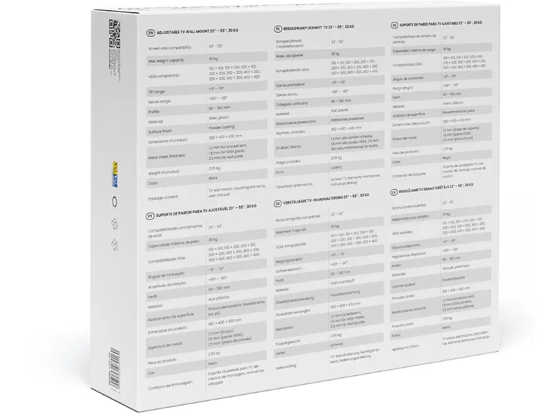 Bezpieczeństwo Twojego telewizora jest absolutnym priorytetem, dlatego uchwyt UTV-03 został zaprojektowany z wyjątkowo solidnej, zróżnicowanej grubości stali, wytrzymującej obciążenie aż do 30 kg. Podstawa montowana do ściany ma grubość 2.5 mm, panel VESA 1.8 mm, a ramiona 1.2 mm, co gwarantuje stabilność całej konstrukcji. Estetyczne malowanie proszkowe chroni uchwyt przed korozją i zarysowaniami, dzięki czemu zachowuje nienaganny wygląd przez lata. Model ten umożliwia precyzyjne dostosowanie pochylenia ekranu – -10° w dół dla wygodnego oglądania z niższej pozycji oraz +3° w górę dla łatwego dostępu do kabli. Długie ramię pozwala regulować odległość telewizora od ściany w zakresie 60–382 mm, zapewniając idealne ustawienie w każdej przestrzeni. Możliwość obrotu ekranu o 90° w lewo lub prawo eliminuje niechciane refleksy i zapewnia perfekcyjną widoczność z dowolnego miejsca w pokoju. Dzięki UTV-03 zyskujesz pełną kontrolę nad komfortem oglądania – od kanapy po aneks kuchenny.